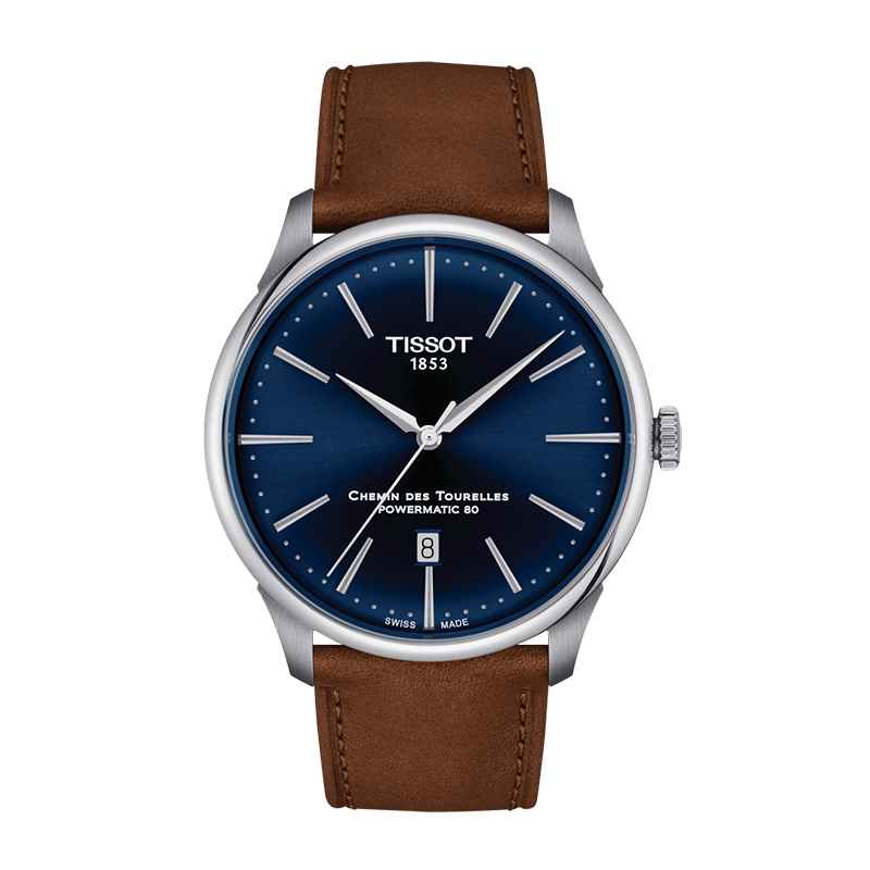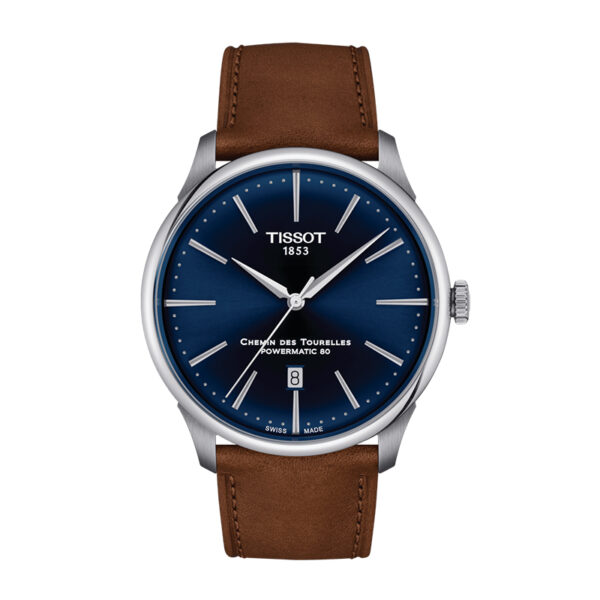 TISSOT CHEMIN DES TOURELLES POWERMATIC 80 boitier 42 mm en acier, cadran bleu, date à 6h, sur bracelet vachette brun