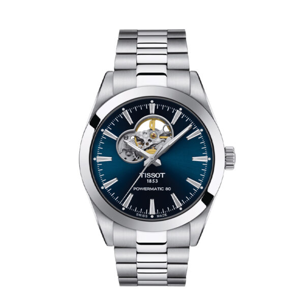 TISSOT GENTLEMAN POWERMATIC 80 mouvement automatique boitier 40 mm en acier, cadran bleu ouvert sur le mouvement, sur bracelet acier