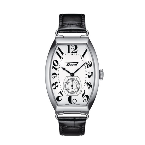 TISSOT HERITAGE mouvement mécanique à remontage manuel, boitier en acier forme tonneau, cadran blanc, réserve de marche 42h, sur bracelet cuir